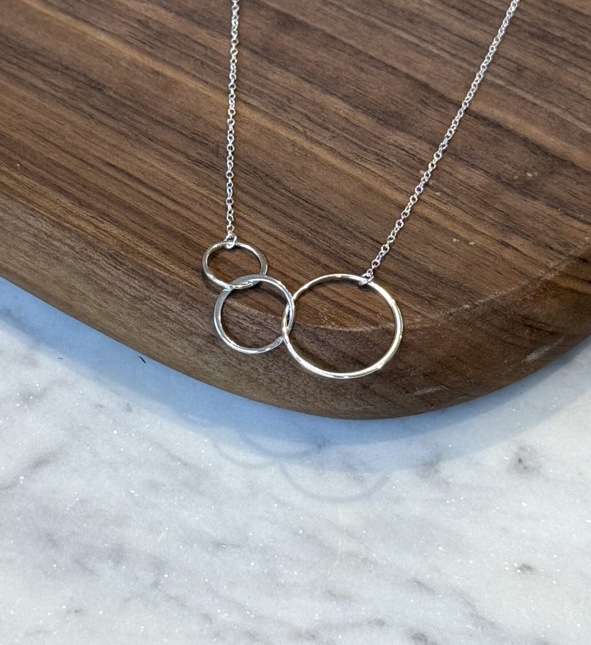 Crafted in solid sterling silver, our Intertwined Rings Necklace features three delicately linked circles. With its clean lines and softly polished finish, this piece is both meaningful and effortlessly elegant.